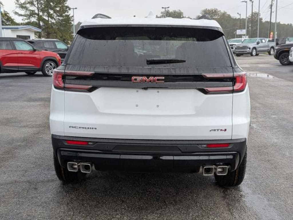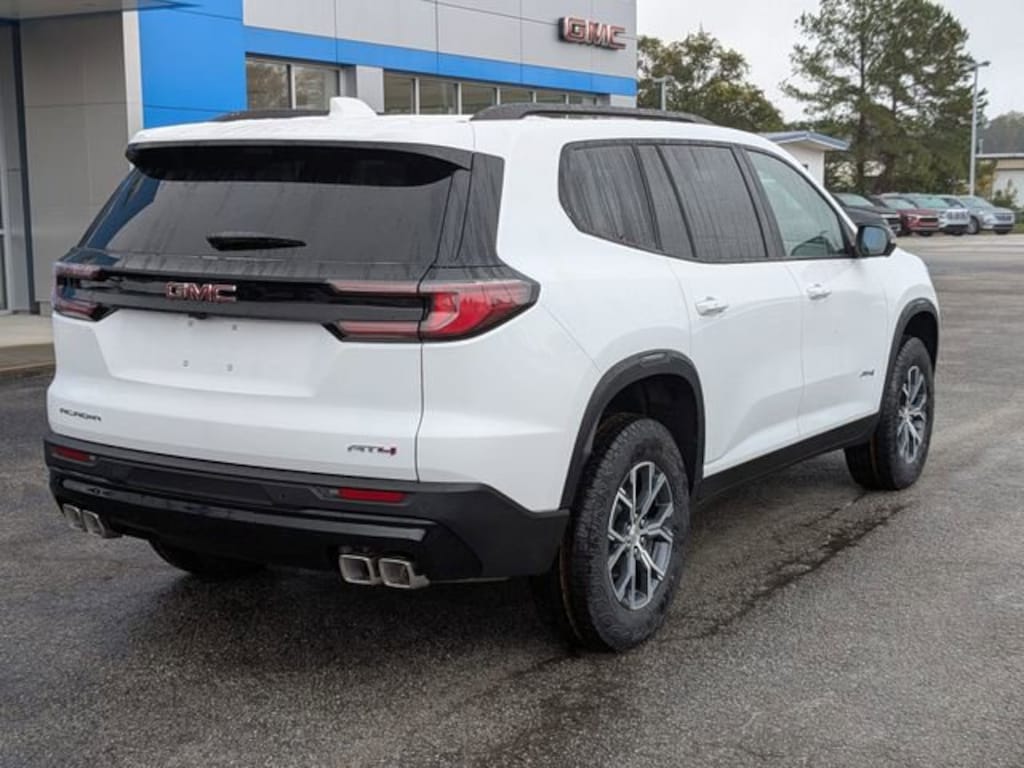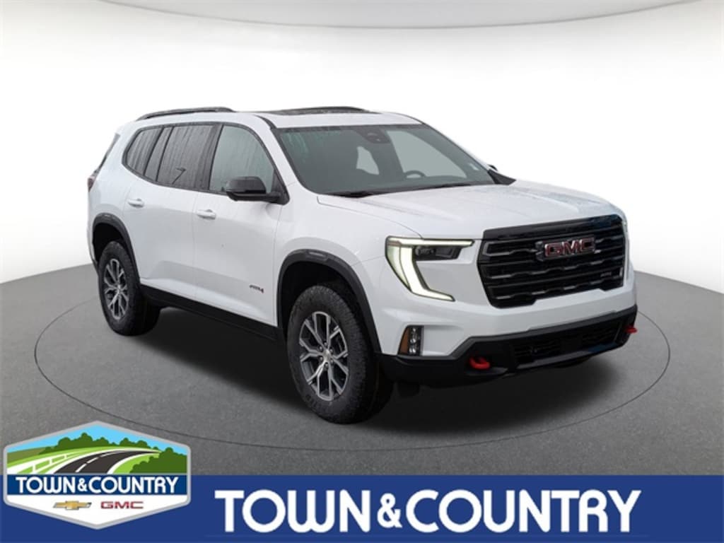 Summit White 2026 GMC Acadia AT4 AWD 8-Speed Automatic 2.5L DOHC AWD, Forest Storm W/Mahogany Accents.